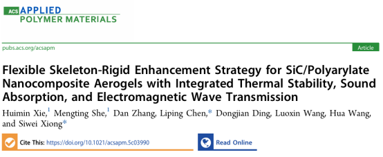 近期,我院王桦、王罗新教授团队本科生谢惠敏在材料科学领域权威期刊《ACS Applied Polymer Materials》(中科院二区)以第一作者发表了题为“Flexible Skeleton-Rigid Enhancement Strategy for SiC/Polyarylate Nanocomposite Aerogels with Integrated Thermal Stability, Sound Absorption, and Electromagnetic Wave Transmission ”的学术论文。williamhill中国williamhill为该论文的第一署名单位,熊思维副教授为论文的指导老师和通讯作者。