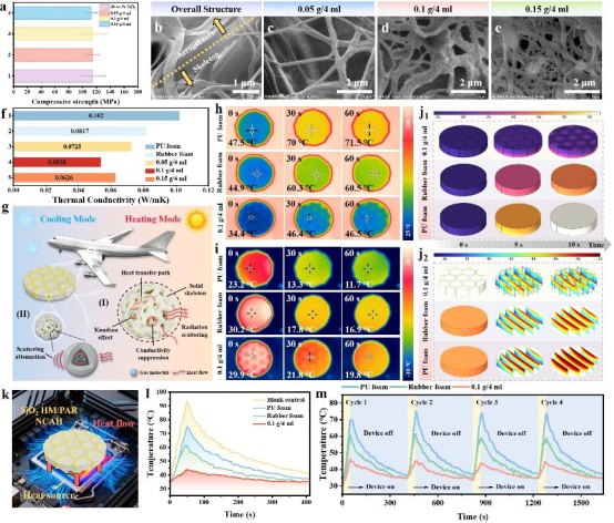 图3对SiO₂ HM/PAR NCAH的热管理性能进行了系统评估。SiO2 HM/PAR NCAH的热导率低至0.0538 W·m⁻¹·K⁻¹,显著低于商用聚氨酯泡沫(0.102 W·m⁻¹·K⁻¹)和橡胶泡沫(0.0817 W·m⁻¹·K⁻¹)。在100℃热台上放置60 s后,其表面温度仅升至46.5℃,而相同条件下两种商用泡沫表面温度分别达到71.5℃和60.5℃;在-10℃冷台上60 s后,材料表面仍可维持在19.8℃,表现出优异的保温性能。有限元热流密度模拟进一步表明,高热阻区域主要集中于材料底部,并沿厚度方向迅速衰减。这一现象可归因于气凝胶的纳米孔结构有效抑制了气体热传导,同时SiO₂空心微球延长了声子传递路径并增加了界面热阻。