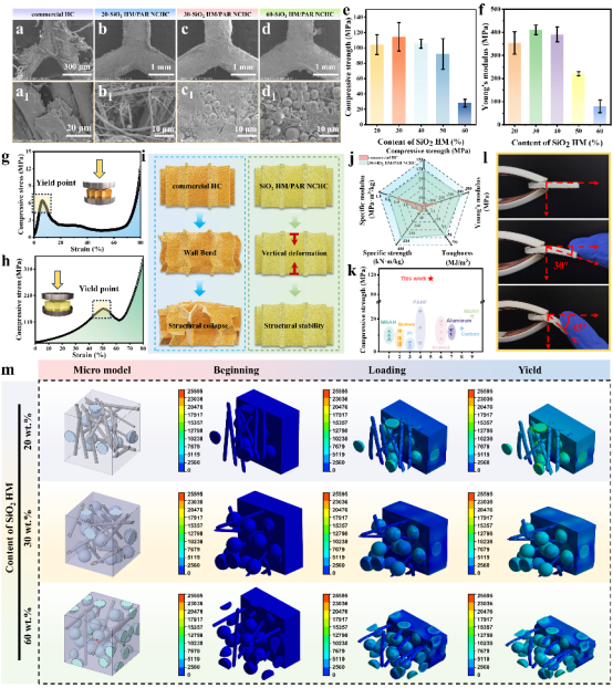 图2展示了SiO₂ HM/PAR NCAH的微观形貌与力学性能。相比于商用芳纶蜂窝节点区可见明显孔隙与界面脱粘现象,SiO₂ HM/PAR NCAH节点区致密无缺陷,PAR纳米纤维均匀包覆SiO₂空心微球,形成以“氢键协同物理缠结”为特征的牢固界面。力学测试结果显示,该材料压缩强度为114 MPa,杨氏模量为411 MPa,韧性达到51 MJ/m³,分别为商用芳纶蜂窝的18倍、5倍和34倍。有限元模拟进一步揭示,在30 wt.%的SiO₂ HM含量下,应力能够均匀传递;而过高的含量(60 wt.%)则会因SiO₂ HM发生团聚,导致力学性能显著下降。