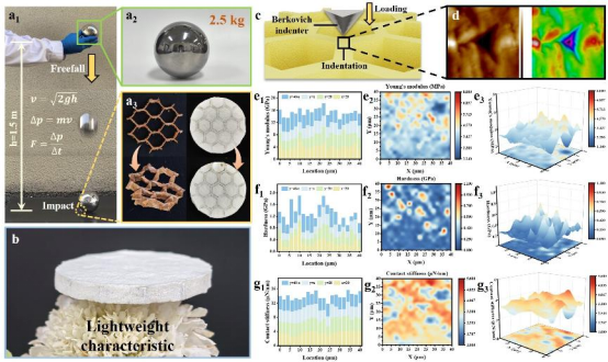 图5对材料的抗冲击性能与微观力学均匀性进行了系统验证。经2.5 kg钢球从1.5 m高度落冲后,蜂窝骨架结构仍保持完整,未发生明显坍塌或胞壁屈曲。纳米压痕测试结果表明,其模量分布于3 ~ 4 GPa之间,硬度在0.4 ~ 0.6 GPa范围内,二者在空间上均呈现均匀分布;界面接触刚度集中于3.3 ~ 4.8 μN/nm,无明显失配现象。上述性能可归因于PAR纳米纤维构成的弹性网络与SiO₂空心微球刚性增强相之间的协同能量耗散机制。