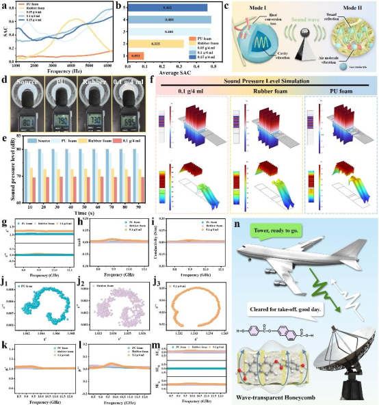 图4展示了SiO₂ HM/PAR NCAH的吸声性能与电磁波透明特性。在1000-6300 Hz频率范围内,该材料的平均吸声系数达到0.484,显著高于商用聚氨酯泡沫(0.093)和橡胶泡沫(0.325)。在实际隔声测试中,其可将80.1 dB的噪声降至69.6 dB,表现出明显的降噪效果。材料的宽频高效吸声源于多尺度协同机制:宏观蜂窝骨架起到声波反射作用,气凝胶芯层通过粘性效应耗散声能,SiO₂空心微球构成Helmholtz共振单元,而纳米纤维则借助振动进一步耗散声能量。同时,该材料在电磁特性方面表现出优异的透明性,其介电常数实部约等于1,损耗角正切低于0.04,屏蔽效能接近于零,因而在需要兼具声学隐身与电磁兼容的集成应用场景中具有良好潜力。