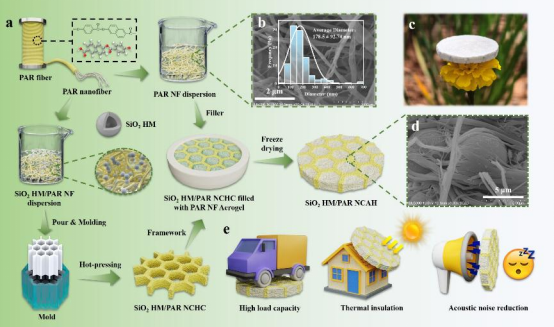 图1 SiO2空心微球/聚芳酯纳米纤维复合气凝胶蜂窝的制备流程与多功能应用