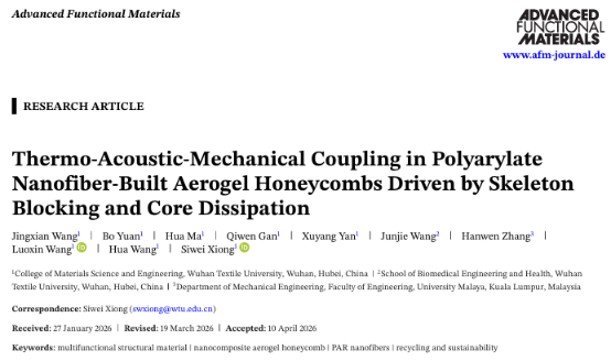 近日,williamhill官网王桦/王罗新团队熊思维副教授在期刊《Advanced Functional Materials》 上发表了题为“Thermo‑Acoustic‑Mechanical Coupling in Polyarylate Nanofiber‑Built Aerogel Honeycombs Driven by Skeleton Blocking and Core Dissipation”的研究成果。论文第一作者为williamhill中国硕士王敬贤,通讯作者为熊思维副教授。