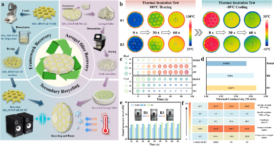 小结:该工作通过“骨架阻隔与芯层耗散”的多尺度耦合机制,成功设计并制备了一种集高力学强度、高效隔热、宽频吸音、电磁透明及闭环可回收于一体的纳米复合气凝胶蜂窝材料。SiO2 HM/PAR NCAH在压缩强度(114 MPa)、热导率(0.0538 W·m-1·K-1)、平均吸音系数(0.484)等方面均显著优于商用芳纶蜂窝、聚氨酯和橡胶泡沫,展现出在航空航天、高速轨道交通等复杂环境下的广阔应用前景。