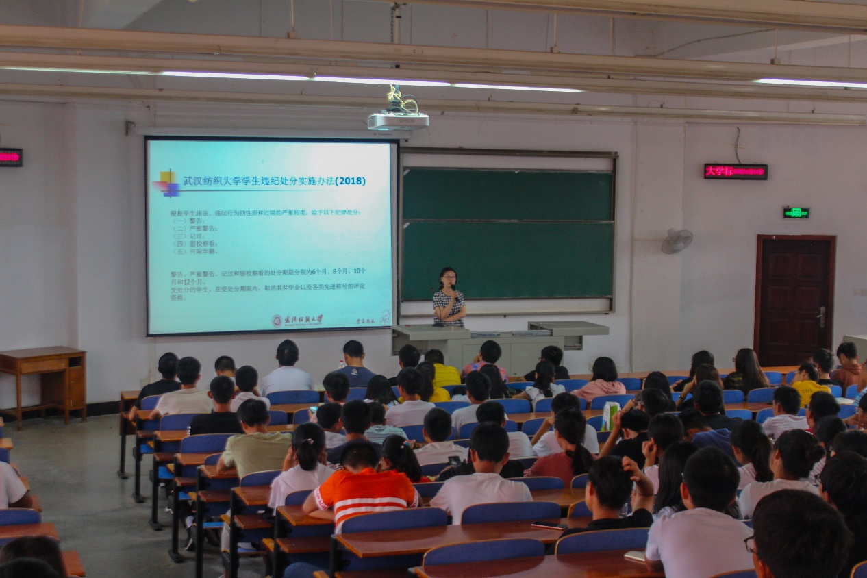 9月30日上午,李姝媛老师和黄鹤老师为大家详细讲解了学籍管理、奖助学金、日常管理相关规定等。李老师介绍了学校内办理教学事务的办公地点和学校的教务处网站。黄老师则重点介绍了转专业,休学,退学,重修的问题、学分的构成,选课的问题、大学生管理规定、本科生考勤及请假管理方法、每周班会及晚点名工作、大学生综合测评积分实施办法、本专科学生国家助学金评选管理办法、本专科家庭经济困难学生认定工作实施办法这八个方面,使新生对大学的规章制度有了一个全面的认识。