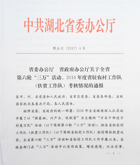 去年年底,由省人大常委会办公厅领导任组长,13个省直单位处级干部为成员的考核验收组到村里进行了实地考核,我校扶贫工作得到了大家的一致肯定,考核成绩位列全省省直驻村工作队前百分之20。考核结果经过省驻农村工作队办公室核查并报省委省政府领导同志同意后,省委专门发文表彰了一批攻坚成绩突出的驻村第一书记,我校对口帮扶贫困村南漳县九集镇双泉村驻村党支部书记郭俊同志名列其中。