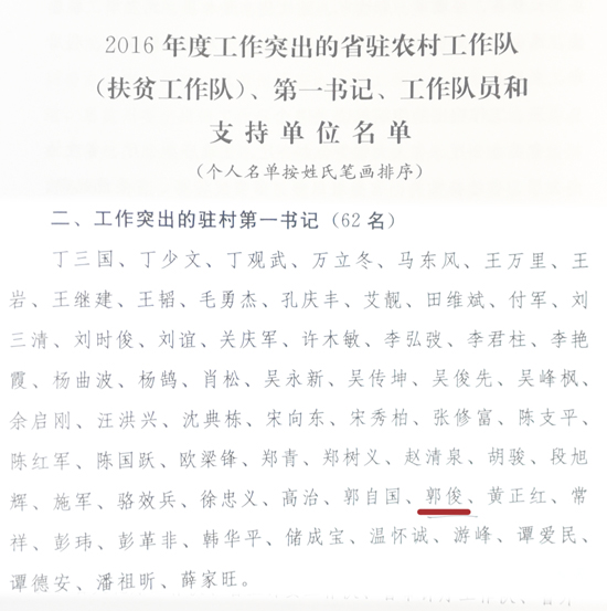 近日,省委办公厅省政府办公厅专门下发文件,对全省第六轮"三万"活动、2016年度省驻农村工作队考核情况进行通报,我校对口帮扶贫困村驻村第一书记郭俊同志因全身心投入,扶贫成效显著得到省委表彰。