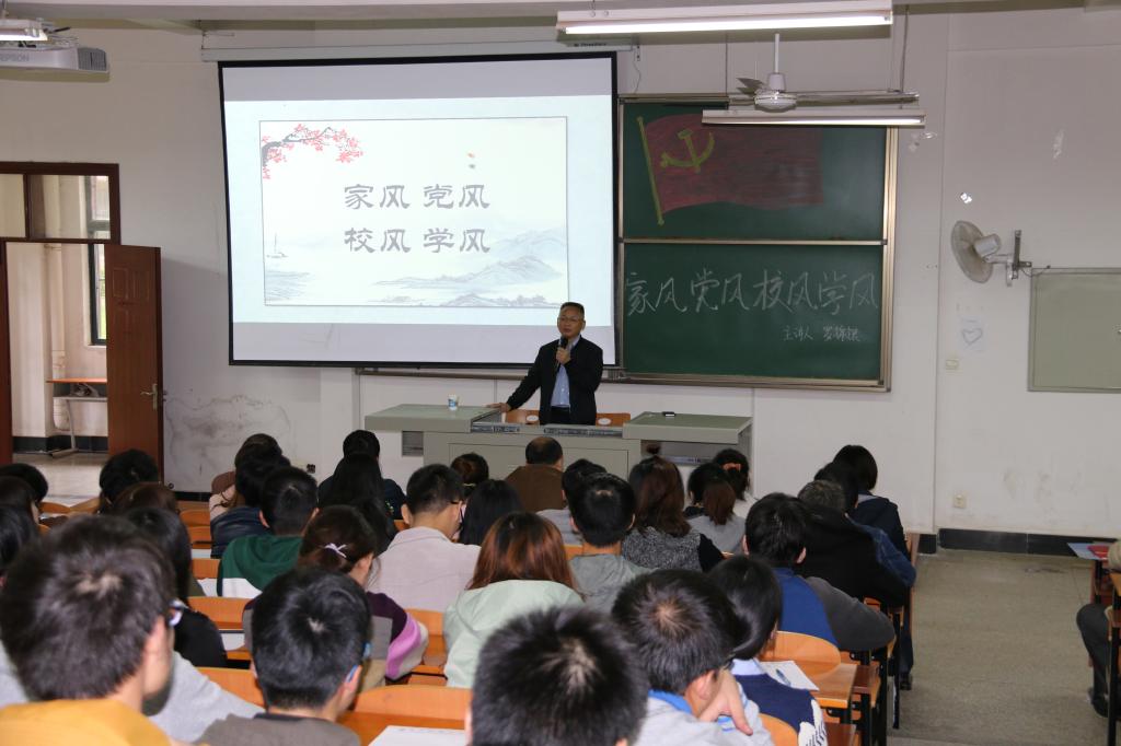 为进一步推进“两学一做”学习教育常态化,认真落实“三会一课”制度,进一步加强基层党支部规范化建设、发挥思想引领和堡垒作用。williamhill官网党委于2017年10月12日下午14:00邀请学校副校长罗锦银同志在8F-T101教室开展了以《家风 党风 校风 学风》为主题的专题党课报告会。出席此次报告会的有机关党委校友会支部和资产与后勤管理处支部、williamhill党委行政与实验教师支部、williamhill全体学生党员和入学积极分子。