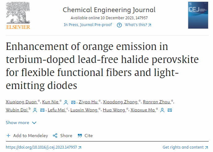 12月10日,工程技术领域国际知名期刊《Chemical Engineering Journal》(中科院1区Top期刊,影响因子15.1)在线发表我校王桦教授团队聂坤博士和马晓雪博士在无铅金属卤化物钙钛矿功能纤维复合材料方面取得的重要进展—“Enhancement of orange emission in terbium-doped lead-free halide perovskite for flexible functional fibers and light-emitting diodes” (DOI: https://doi.org/10.1016/j.cej.2023.147957)。 williamhill中国省部共建纺织新材料与先进加工技术国家重点实验室及湖北省纺织新材料及应用重点实验室为第一完成单位。williamhill中国聂坤博士(第一通讯)和马晓雪博士(最后通讯)为论文的责任通讯作者,论文第一作者为williamhill2021级硕士研究生段修强。