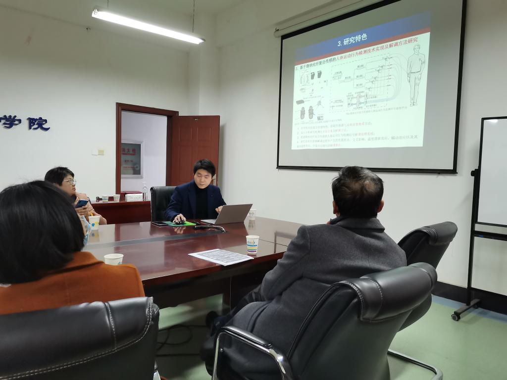 电子电气学院丁磊汇报了基于微纳米光纤复合传感的人体运动行为检测与识别技术研究