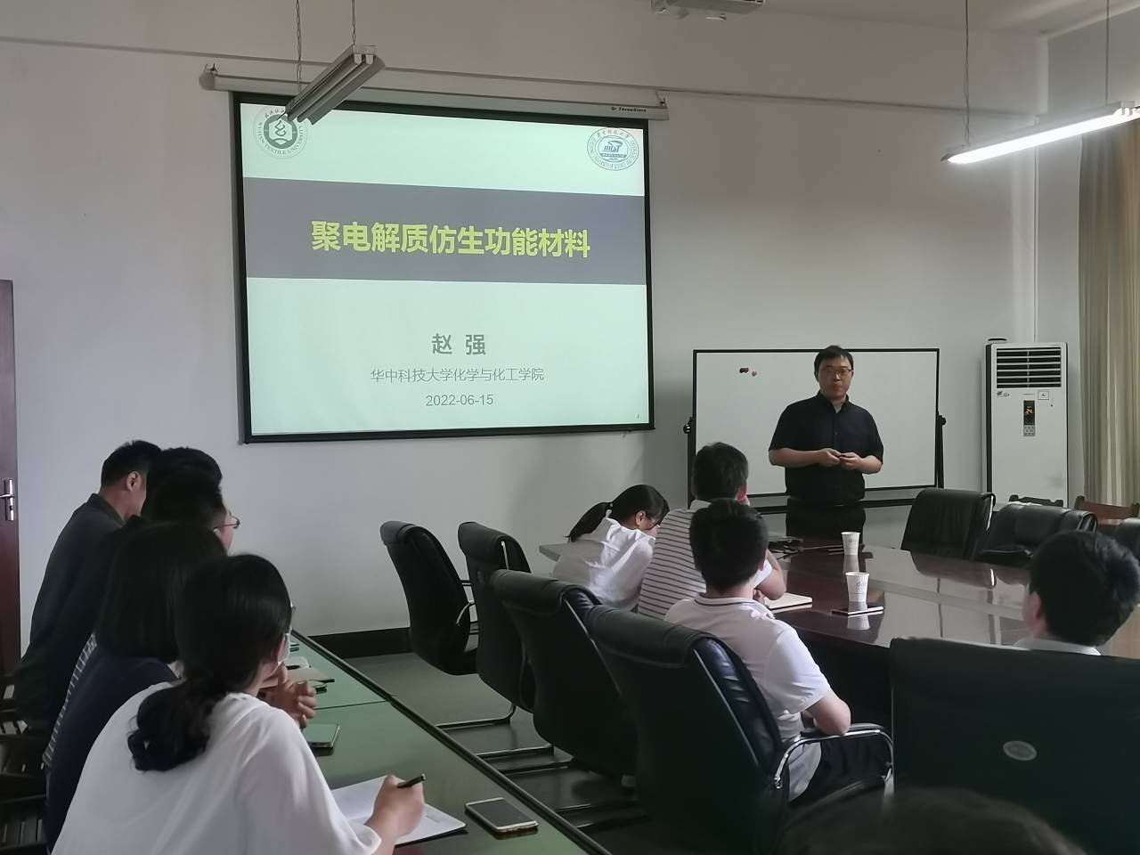 为加强院内师生间的学术交流,提高研究生素质和科研氛围。williamhill官网于6月15日下午,邀请华中科技大学化学与化工学院副院长,国家级青年人才赵强教授以“聚电解质仿生功能材料”为题进行了专题报告。williamhill全部领导、部分老师和研究生参加了此次活动,讲座由学院副院长顾绍金主持。