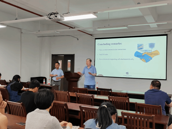 首先,姜伟教授介绍了Donghong Yu(于冬宏)副教授的科研和工作经历,并对于教授的到来表示热烈欢迎。随后,于教授先详细介绍了奥尔堡大学的基本情况以及研究生招生情况。随后于教授做了以““Tough SiO2-Polymer Hybrids”为题的学术报告。报告围绕韧性二氧化硅杂化材料的制备展开,从二氧化硅纳米粒子的表面改性和聚合出发,通过二氧化硅的溶胶-凝胶反应的控制,调控聚合物的链结构和二氧化硅的凝胶过程,实现了韧性的二氧化硅杂化材料的构筑。于教授深入浅出地讲解了如何从材料的应用出发,对高杂化材料结构的合理设计,实现材料性能的调控。报告为学生从高分子合成角度出发,理解高聚合物的结构性能关系给出了很好的示范。报告结束后与于教授与参会的师生进行了热烈的交流,并认真详细地解答了师生们的问题。最后,参会师生对陈教授表示了诚挚感谢。
