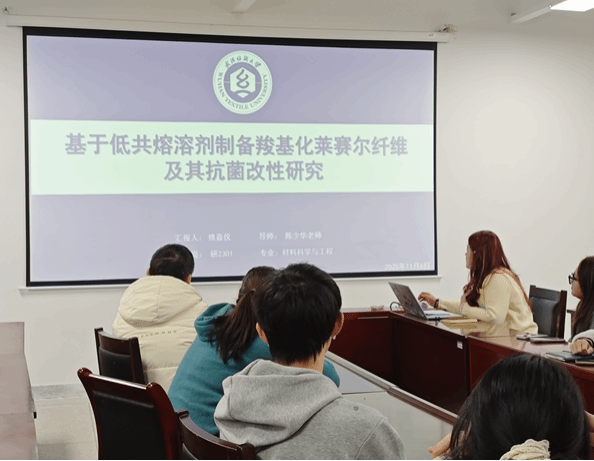 姚嘉仪同学以《基于低共熔溶剂制备羧基化莱赛尔纤维及其抗菌改性研究》为题,针对传统抗菌纤维制备中存在的毒性大、手感差、耐久性不足等问题,开发了一种基于低共熔溶剂的绿色羧基化改性路径,并进一步通过负载铜离子与季铵盐实现对莱赛尔纤维的高效抗菌功能化。改性纤维对大肠杆菌和金黄色葡萄球菌的抑菌率均高达99.99%,且细胞相容性良好,在医用敷料与功能性纺织品领域具有重要应用价值。