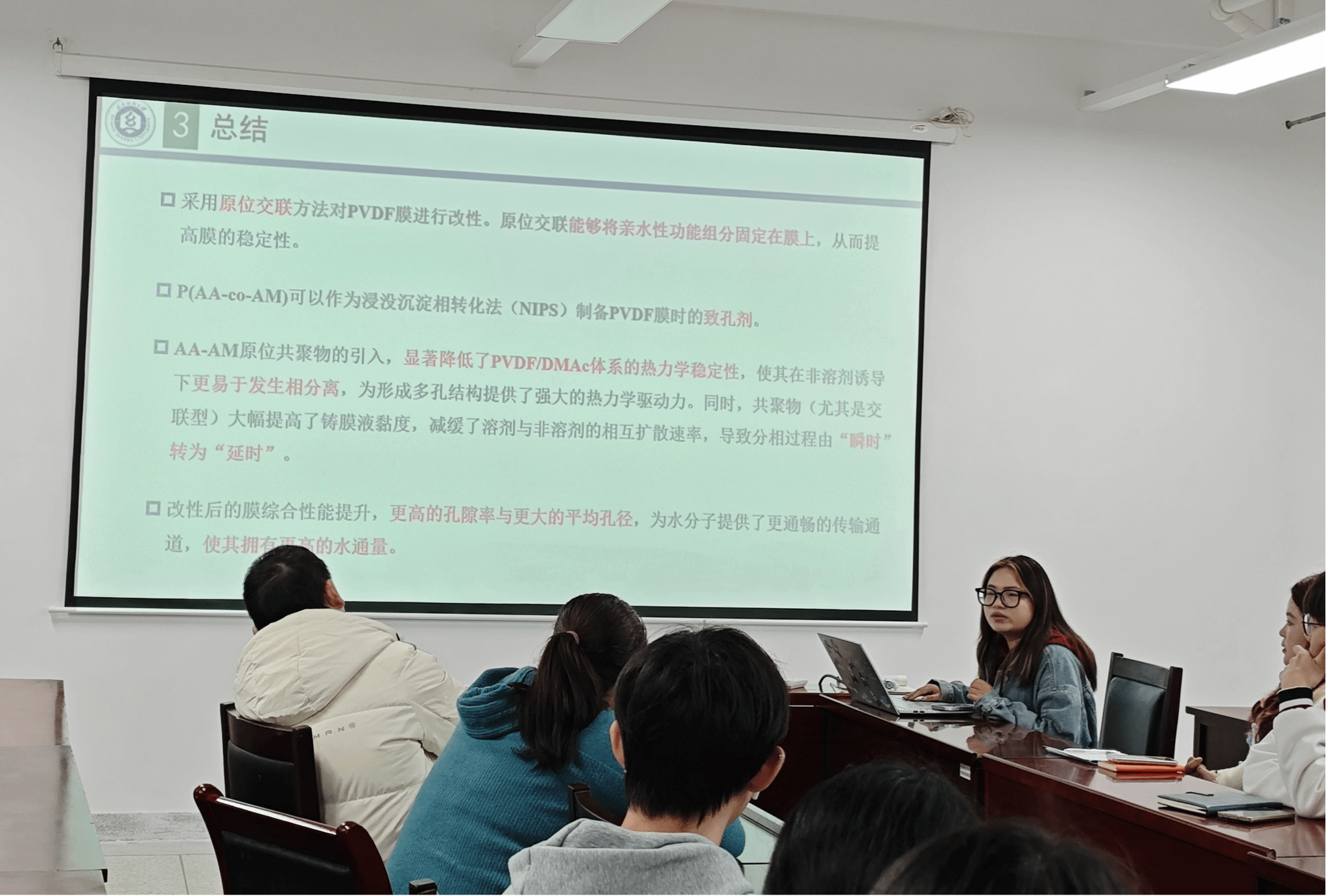 贺嘉欣同学汇报的《P(AA-co-AM)共聚物改性PVDF膜的性能及其应用研究》,聚焦PVDF膜强疏水性导致的通量衰减与污染严重等问题,创新性地采用原位交联共聚方法将亲水性P(AA-co-AM)引入PVDF膜中。研究结果表明,改性后的膜材料孔隙率与平均孔径显著提升,水通量提高至原始膜的3倍,并有效延缓污染进程,为高性能分离膜在污水处理与资源化领域的应用提供了新思路。
