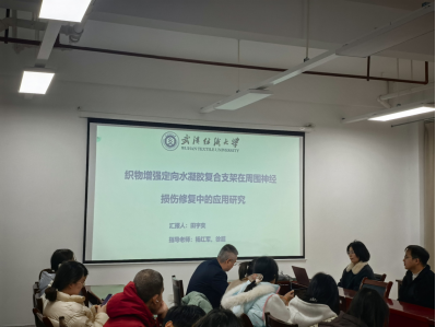 田宇奕同学在杨红军、徐超老师指导下,汇报《织物增强定向水凝胶复合支架在周围神经损伤修复中的应用研究》。针对全球每年约 100 万人受周围神经损伤影响,以及自体移植供体有限、异体移植易引发免疫排斥等问题,团队创新性地将压电材料 KNN 引入神经引导导管(NGC),制备 MSF-GK 复合导管。该导管采用定向冷冻、冻干等工艺制成,兼具优异的生物相容性、可注射自修复性能及良好机械强度,外层轴向微孔可防止结缔组织长入并促进营养运输,内层编织层提供力学支撑,超声激发的压电电刺激能有效促进神经再生。动物实验表明,MSF-GK/US 导管可显著改善大鼠后肢神经功能、减轻肌肉萎缩,神经丝再生及髓鞘形成效果接近自体移植,为周围神经损伤修复提供了新方案。