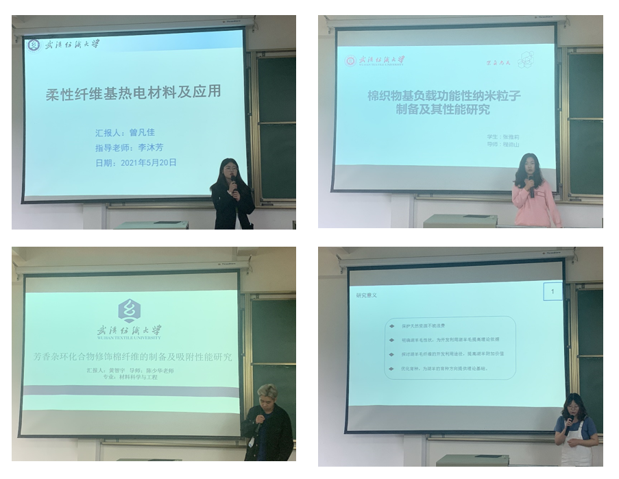 论坛上,曾凡佳、张雅莉、黄智宇、陈梦莹、范群梅、唐子杰、王浩、杨银芝八位同学分别围绕“柔性纤维基热电材料及应用”“棉织物基负载功能性纳米粒子制备及其性能研究”“芳香杂环化合物修饰棉纤维的制备及吸附性能研究”“湖羊毛性能分析及应用研究”“Silk I 结构丝素蛋白多孔海绵内构建三微纳米纤维结构用于软组织修复”“基于专利分析水刺部件的发展趋势”“新型阻燃环氧树脂材料制备与性能研究”“微纳米复合材料的制备及其研究”就自己的研究内容及成果等方面分别进行了汇报交流。