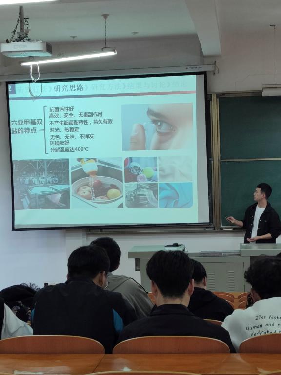最后一个同学周祥介绍了聚六亚甲基双胍盐作为抗菌纸的特点:抗菌活性好、高效、安全、无毒副作用等,并介绍了该抗菌纸制备工艺流程及性能测试,得出SP/CFPLA-6%抗菌纸具有可降解、高强度、抗菌和高阻隔性的特点,可作为传统不可降解塑料包装材料的替代品。