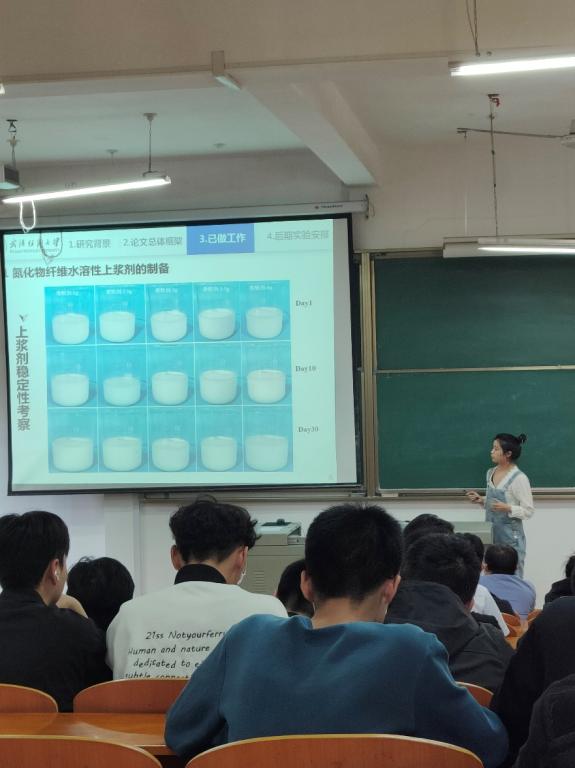 11月3日,williamhill官网罗飘、付露、周祥三位同学分别给学院全体研究生作以“氮化物纤维上浆剂的制备及纤维表面处理改性的研究”、“木材基光热水蒸发器件的制备及性能研究”和“聚六亚甲基双胍/纤维素/聚乳酸纤维复合抗菌纸的简易制备工艺“为主题的三场专题报告。