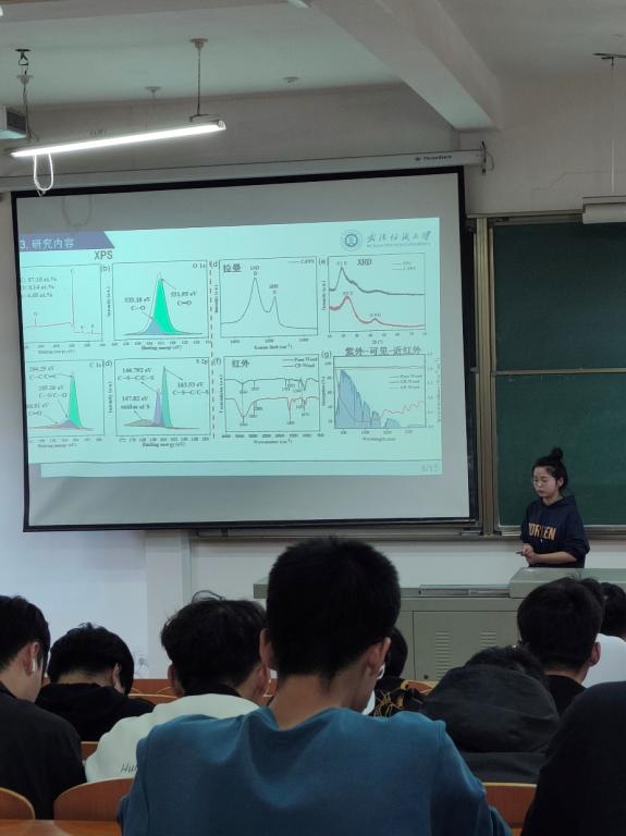 随后,付露同学介绍了木材基光热水蒸发器件的制备及性能研究,木材纤维素含量丰富,成本低,将硫掺杂碳和木材复合制备蒸发器件是较为高效的选择。探究了不同高度木材蒸发器的水蒸发速率,通过自己的实验数据,得出硫掺杂碳相比于纯碳含有更高的水蒸发速率的结论,表明了硫元素存在的意义,也证实了其在室外自然环境下依然具备优异的净水能力。