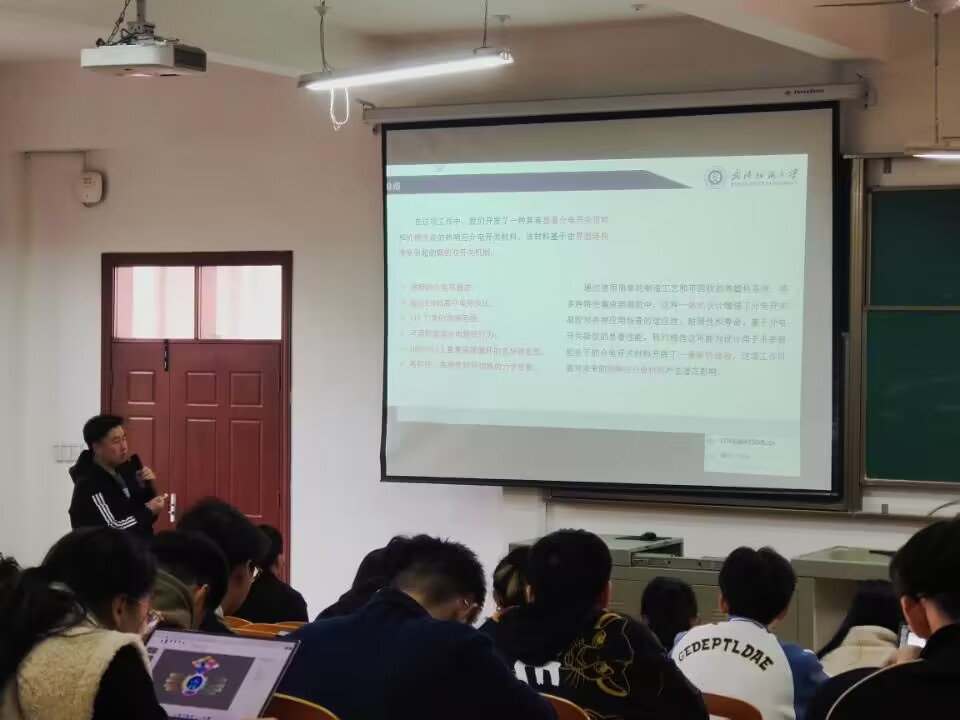 第一位汇报人周玮杰报告了一种新的室温加工策略,通过SBS和冷压的结合,生产出具有良好介电和机械性能的极性相优先的PVDF/PAN纳米纤维薄膜,并指出这种高效的室温工艺具有降低能耗和改善介电性能的优点,在工业应用中具有很大的潜力。