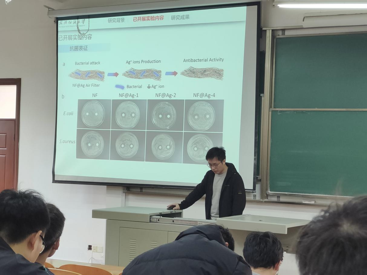 最后一个同学尧智介绍了纳米纤维基高效杀菌抗病毒空气过滤材料的制备及性能研究的相关内容,向同学们介绍到研究对象是用于高性能可重复使用空气过滤材料的高效抗菌、透湿、光热灭菌Janus 纳米纤维膜。并介绍到实验过程中所涉及的接触角和透湿量实验、空气过滤性能实验、抗菌表征实验以及光热自清洁实验。最后介绍到目前所得到的一些研究成果以及专利等。