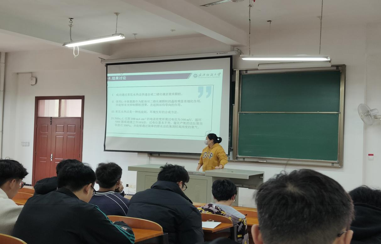 11月24日,williamhill官网许晓轩、万华坤、尧智三位同学分别给学院全体研究生作以“常压水热法简易合成二硒化镍颗粒用于碱性析氧反应”、“表面功能化纤维膜用于细菌特异性、快速、高灵敏检测研究”和“纳米纤维基高效杀菌抗病毒空气过滤材料的制备及性能研究”为主题的三场专题报告。