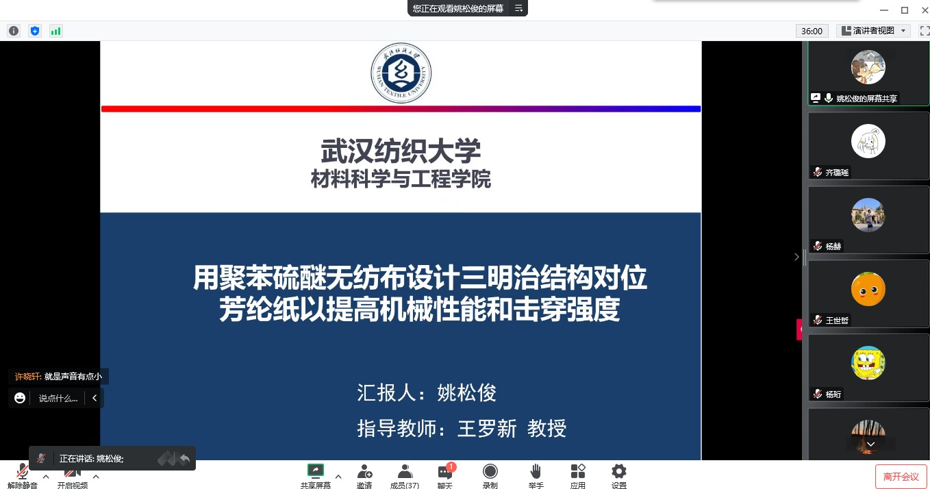 随后,姚松俊同学介绍了用聚苯硫醚无纺布设计三明治结构对位芳纶纸以提高机械性能和击穿强度目前的研究现状:目前芳纶纸因其优异的力学性能,耐高温,绝缘且质量轻,被广泛用于航空航天、轨道交通和国防军工等行业。并详细地介绍了自己的研究内容及技术路线,并详细地谈到了实验过程中所用到的制备方法以及实验部分如何制备样品和最终实验表征结果的讨论。最后介绍到目前所得到的一些研究成果以及专利等。