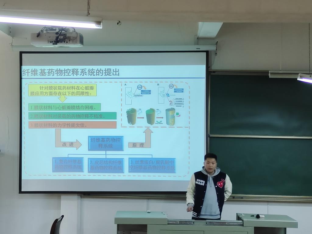 首先,刚汉林同学介绍了由于膜状载药材料在心脏瓣膜应用方面存在着与心脏瓣膜结合困难、对装载的药物控释不精准以及模状材料力学性能欠佳等局限性,因此急需对纤维基药物控释系统进行改进。在此次报告中刚汉林同学着重讲解了三种纤维基药物控释系统的制备与研究,它们分别是复合纤维基药物控释系统、皮芯结构纤维基药物控释系统和丝素蛋白/聚乳酸中空纤维基药物控释系统。