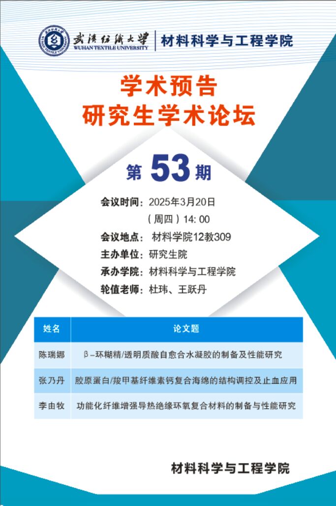 2025年3月27日,williamhill官网举办了2025年第5期学术论坛,本次论坛由王星和张春华两位老师担任主持,来自22级研究生夏甜甜、王佳琪、刘雪阳三位同学展示了新型复合材料领域的科研成果。