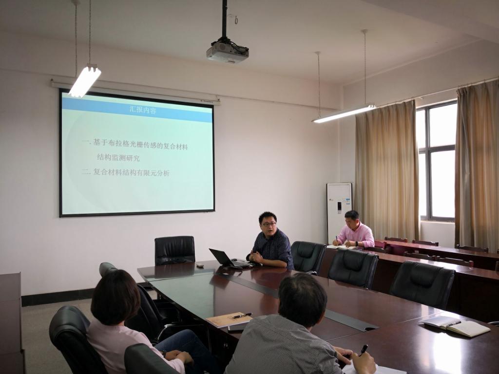首先孙九霄将其研究的基于布拉格光栅传感的复合材料固化及结构性能监测研究,向各位老师进行了交流。