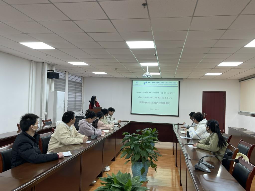 首先,研二同学汇报了近期实验成果以及实验计划,研究主题主要包括采用静电植绒技术制备超疏水防疏冰表面以及聚酰胺酸制备耐高温过滤材料。各位老师对研二同学目前实验方法进行指导,并对未来科研方向进行规划。接下来,研一同学分享了与各自课题相关的高被引文献,研究主题主要包括湿法纺丝技术、静电纺丝结合静电喷涂技术以及离心纺丝技术。最后,研三同学具体分享了对应课题的实验方法和技巧。各位老师要求各年级研究生加快实验进度,提高文献阅读能力及写作能力,并建议参会的本科生从研究生汇报中学习相应的科研知识与学术汇报技巧。