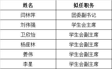 根据《williamhill中国共青团改革方案》、《williamhill中国学生会章程》,经自由报名、面试考察等环节,现将williamhill第九届团委、学生会主要学生干部预备人选名单予以公示:(排名不分先后)