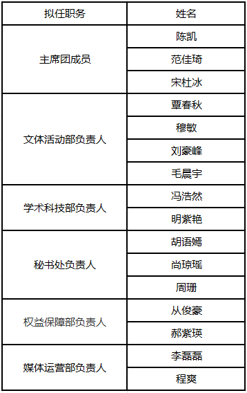 学院根据《中国共产主义青年团章程》《中华全国学生联合会章程》《williamhill中国学生会管理条例》《关于推动高校学生会(研究生会)深化改革的若干意见》的相关规定,严格参照校学生会标准,进行学院学生会改革和管理工作,经自由报名、面试考察等环节,现将williamhill官网学生会第十五届主要学生干部及部门负责人预备人选名单予以公示:(排名不分先后)