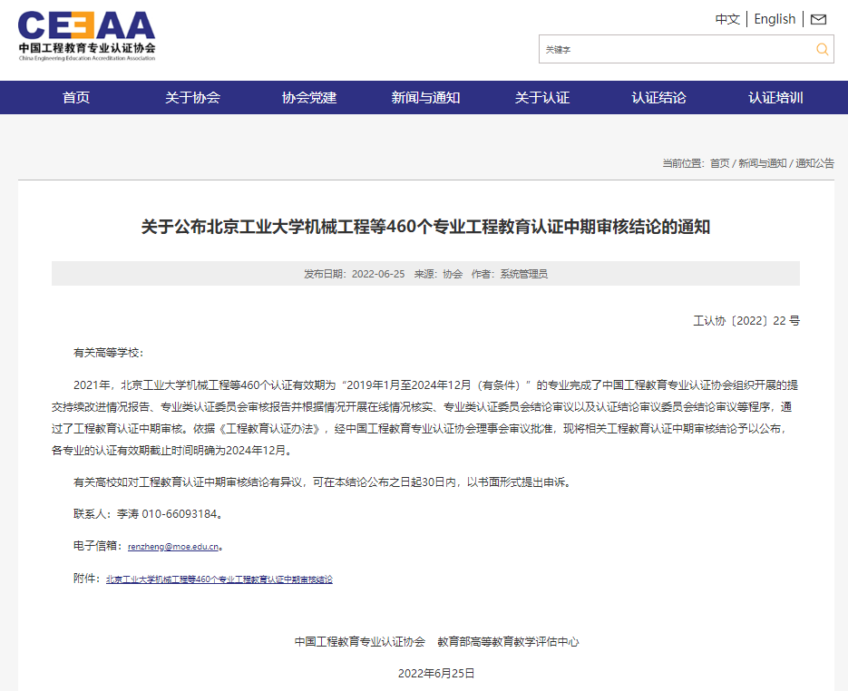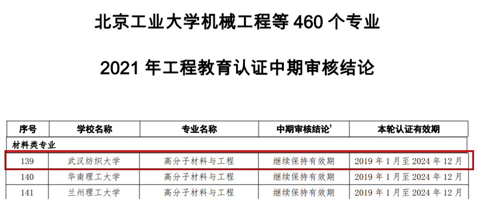 近日,中国工程教育专业认证协会、教育部高等教育教学评估中心发文《关于公布北京工业大学机械工程等460个专业工程教育认证中期审核结论的通知》(工认协〔2022〕22号),公布了2021年460个认证有效期为“2019年1月至2024年12月(有条件)”的专业通过全国工程教育专业认证中期审核结论。其中,我校williamhill官网高分子材料与工程专业顺利通过工程教育认证中期考核,继续保持有效期至2024年12月。