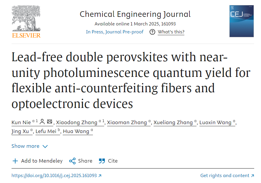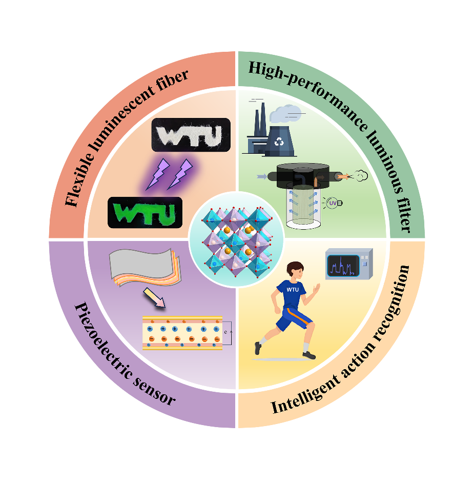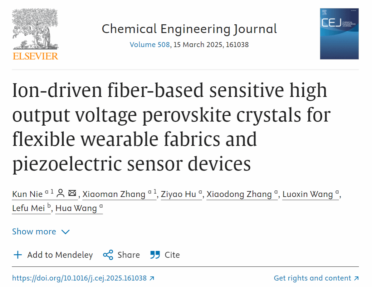 近日,工程技术领域国际知名期刊《Chemical Engineering Journal》(中科院大类1区Top期刊,影响因子IF=13.4)三天内连续在线发表2篇我校王桦教授团队聂坤博士在功能纤维复合材料方面取得的重要进展—“Ion-driven fiber-based sensitive high output voltage perovskite crystals for flexible wearable fabrics and piezoelectric sensor devices” (DOI: https://doi.org/10.1016/j.cej.2025.161038),以及“Lead-free double perovskites with near-unity photoluminescence quantum yield for flexible anti-counterfeiting fibers and optoelectronic devices” (DOI: https://doi.org/10.1016/j.cej.2025.161093) williamhill中国(williamhill官网、湖北省纺织新材料及应用研究重点实验室及纺织新材料与先进加工全国重点实验室)均为两篇论文的第一完成单位且唯一通讯单位。williamhill中国聂坤博士为两篇论文的唯一通讯作者且第一作者。其中一篇论文共同第一作者为williamhill2023级硕士研究生张晓满,另一篇论文的共同第一作者为williamhill2022级硕士研究生张笑冬。