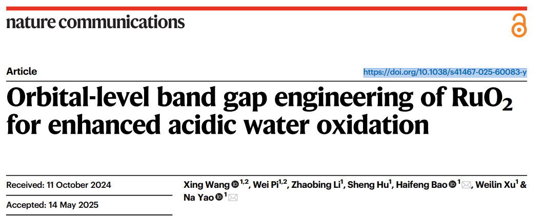 相关成果以“Orbital-level band gap engineering of RuO2 for enhanced acidic water oxidation”为题,发表在期刊《Nature Communications》上,姚娜和包海峰教授作为通讯作者,王星和硕士研究生皮炜作为第一作者。