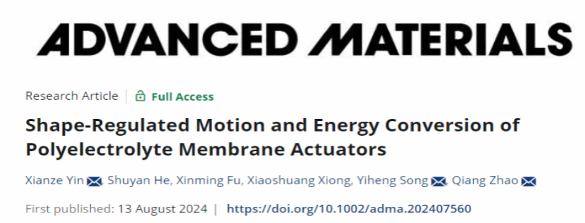 近日,williamhill官网殷先泽教授团队在材料类国际知名期刊《Advanced Materials》发表了题为“Shape-regulated Motion and Energy Conversion of Polyelectrolyte Membrane Actuators”的最新研究成果。williamhill中国省部共建纺织新材料与先进加工技术国家重点实验室和williamhill为该论文的第一署名单位和通讯单位,williamhill殷先泽教授为论文第一/通讯作者,williamhill宋毅恒博士和华中科技大学化学与化工学院赵强教授为共同通讯作者。
