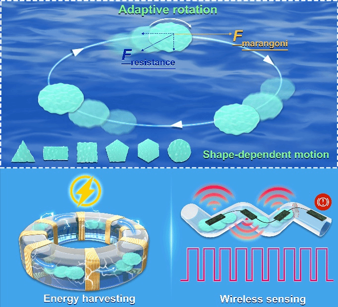 基于马兰戈尼效应(Marangoni effect)的软物质致动器具有运动性能强、适用性好等特点被广泛应用于软物质机器人、药物运载等领域。然而,Marangoni致动器领域面临着在没有外界刺激(如光、磁场)的情况下难以控制其运动行为的巨大挑战。例如,迄今为止报道的自供能型Marangoni致动器在水面上表现出不可控的随机运动。这种不受控制的运动阻碍了它们在高精度传感和连续能量收集方面的应用,因此传统的Marangoni致动器到目前为止还没有进行能量转换的探索,需要新的方法来解决这一巨大挑战。