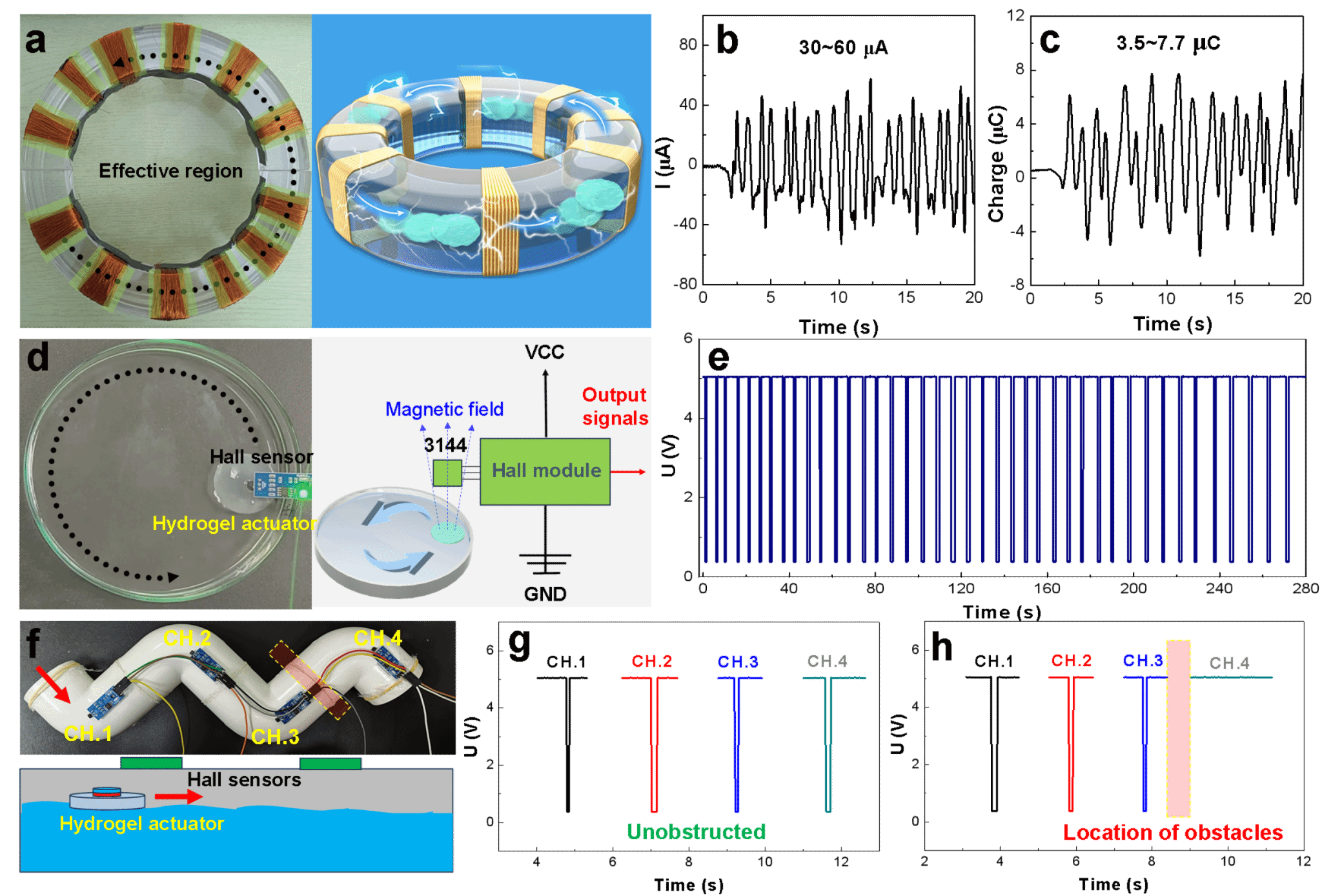 基于已获得的规则圆周运动特性,本研究将致动器组装成电磁发电模块和无线传感模块。在电磁发电模块中,携带强磁特性的致动器规则而连续的通过线圈有效区域而持续对外放电实现能量收集;在无线传感模块中,圆形致动器规则的通过霍尔传感区获得规律的数字电信号。结合其优异通过性,并实现在封闭不可视管道内部的障碍物无线传感及定位应用。