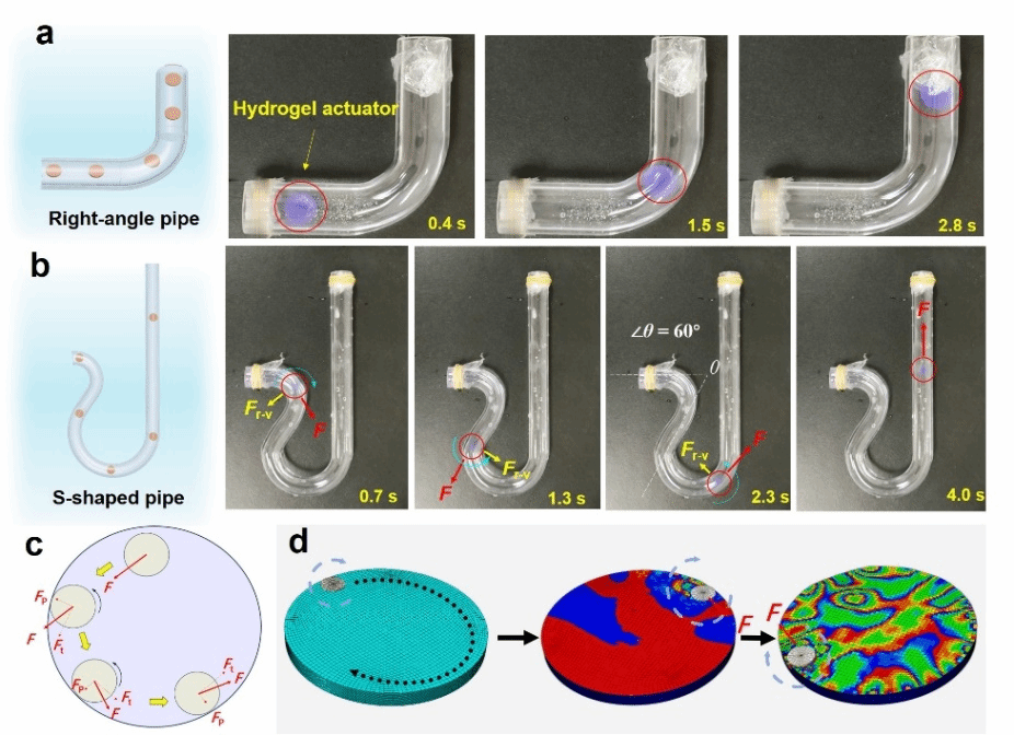 更进一步的,该研究发现圆形致动器的“贴壁运动”及在拐角处的“自适应旋转(Adaptive rotation)”特性,这使得致动器在有限封闭环境(如带拐角的不同尺寸容器)中沿着容器壁运动,并在拐角处通过自适应旋转改变前进方向。这使其在封闭环境中具备了优异的通过性能,在管道疏通、封闭环境运载方面具有巨大应用潜力。