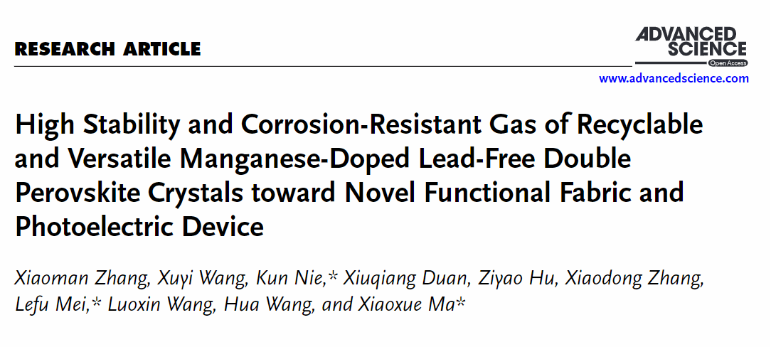 近日,综合性国际著名期刊《Advanced Science》(中科院大类1区Top期刊,影响因子IF=15.1)在线发表我校williamhill王桦教授团队聂坤博士和马晓雪博士等在无铅双钙钛矿与功能纤维复合材料方面取得的重要进展—“High Stability and Corrosion-Resistant Gas of Recyclable and Versatile Manganese-Doped Lead-Free Double Perovskite Crystals toward Novel Functional Fabric and Photoelectric Device” (DOI: https://doi.org/10.1002/advs.202403352)。williamhill中国为论文的第一署名单位。williamhill中国聂坤博士为第一通讯作者,马晓雪博士为共同通讯作者,论文第一作者为williamhill2023级硕士研究生张晓满。