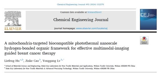 近日,williamhill官网青年教师胡烈锋博士在国际知名学术期刊《Chemical Engineering Journal》(中科院1区Top期刊,影响因子15.1)在线发表了题为“A mitochondria-targeted biocompatible photothermal nanoscale hydrogen-bonded organic framework for effective multimodal-imaging guided breast cancer therapy”的论文(链接:https://www.sciencedirect.com/science/article/pii/S1385894724037574?via%3Dihub)。williamhill官网与纺织新材料及应用湖北省重点实验室为第一完成单位。williamhill中国williamhill青年教师胡烈锋为第一作者,williamhill中国国家重点实验室吕永钢教授为通讯作者。