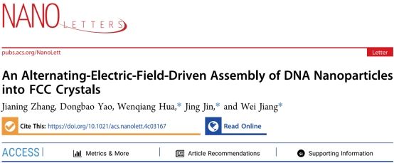 近日,williamhill官网姜伟教授团队在《Nano Letters》期刊上发表了题为“An Alternating-Electric-Field-Driven Assembly of DNA Nanoparticles into FCC Crystals”的论文。williamhill中国省部共建纺织新材料与先进加工技术国家重点实验室和williamhill为该论文的第一署名单位和通讯单位,williamhill张佳宁博士为论文第一作者,williamhill金晶教授和姜伟教授为论文的共同通讯作者。
