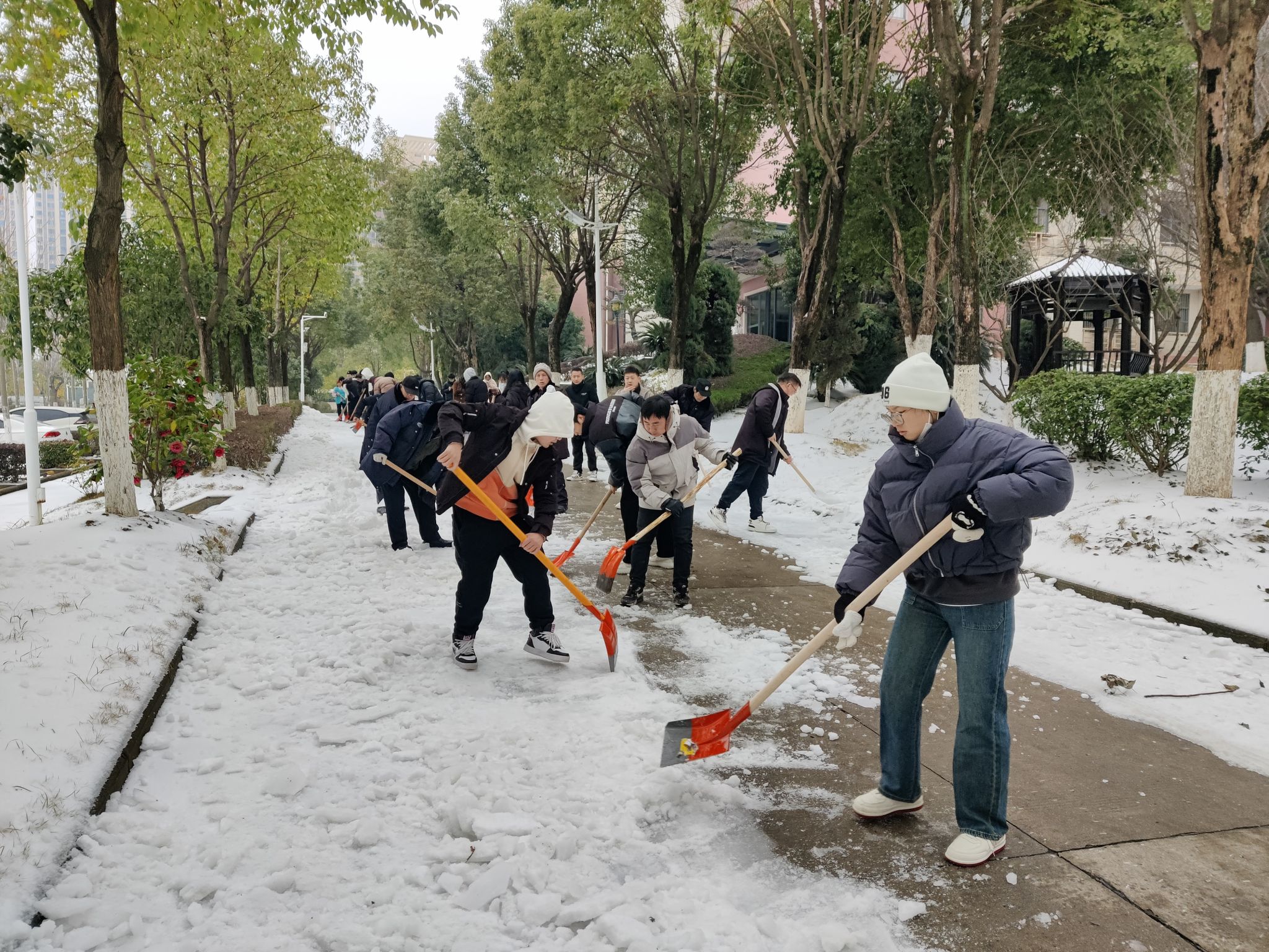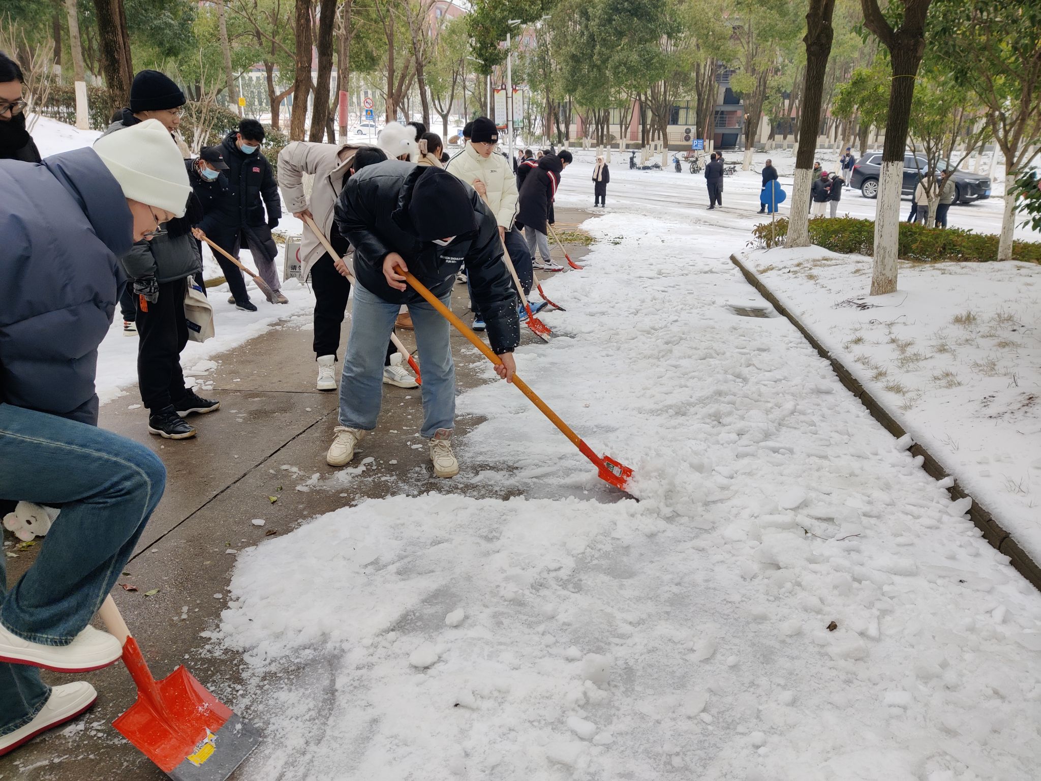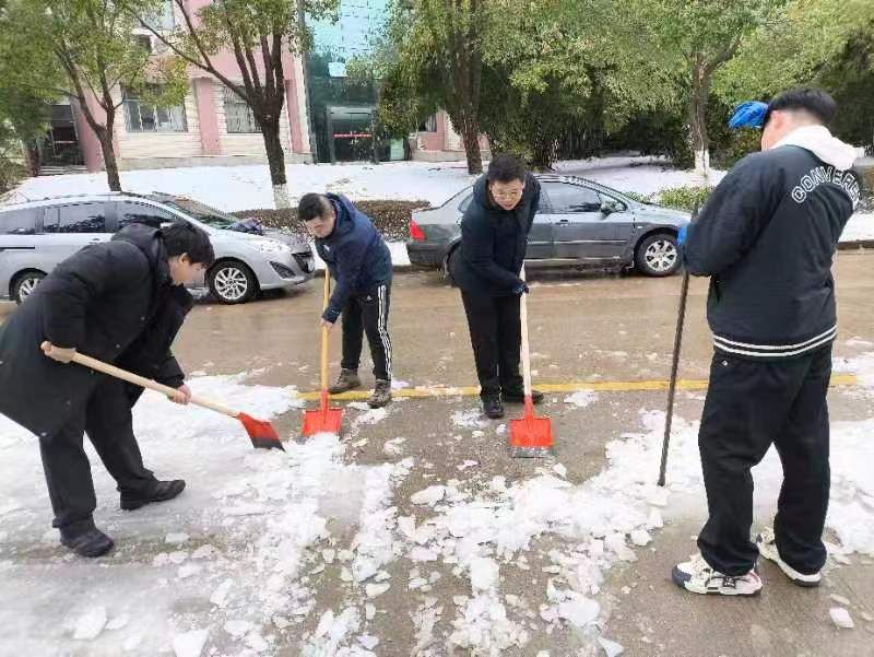 在大家的共同努力下,学校行政楼、八栋等位置的机动车道和人行便道很快变得安全通畅。党员同志们也表示这次扫雪除冰活动不仅践行了初心、考验了担当,更增进了团结。