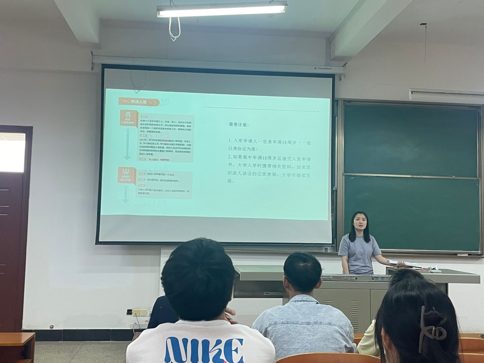 接着,学院学生党建工作负责人、本科生一支部王鑫对学院学生党支部基本情况、近期党建工作要点做详细介绍,深刻解读了发展党员工作流程图。她提出,要严格规范发展党员的相关流程,从积极分子及发展对象的选拔,到预备党员的接收,到最后预备党员的转正,要严格按照党员发展的流程规范开展;同时各支部要吸取教训,严格审核党员发展材料,发现问题及时改正,确保党员材料准确无误,完善完备;对于党员档案和毕业生党员党组织关系转接各支部实行支委包保、支部书记审核、学生党建服务中心复审制度,确保档案完备无误,顺利交接。