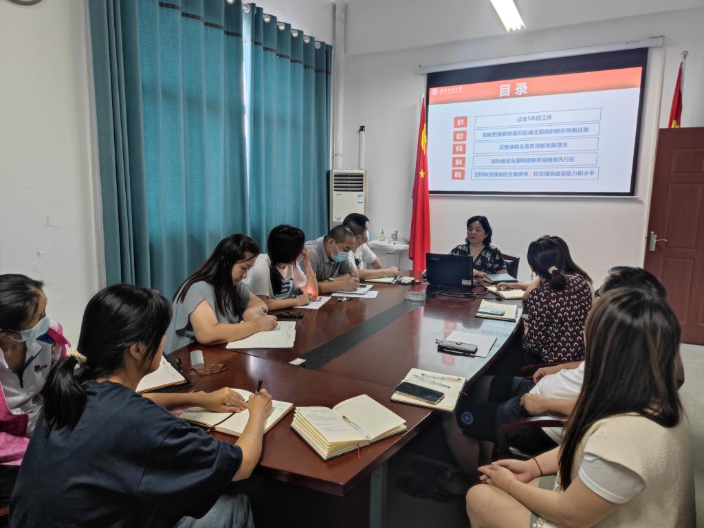 陈桂枝书记围绕湖北省第12次党代会精神,分别从过去五年的工作、准确把握新发展阶段湖北面临的新形势新任务、完整准确全面贯彻新发展理念、加快建设全国构建新发展格局先行区、坚持和加强党的全面领导五个方面带领同志们进行了认真学习,并结合高校网络信息安全、当代大学生思想政治引领、开学迎新等工作实际进行针对性讲解。