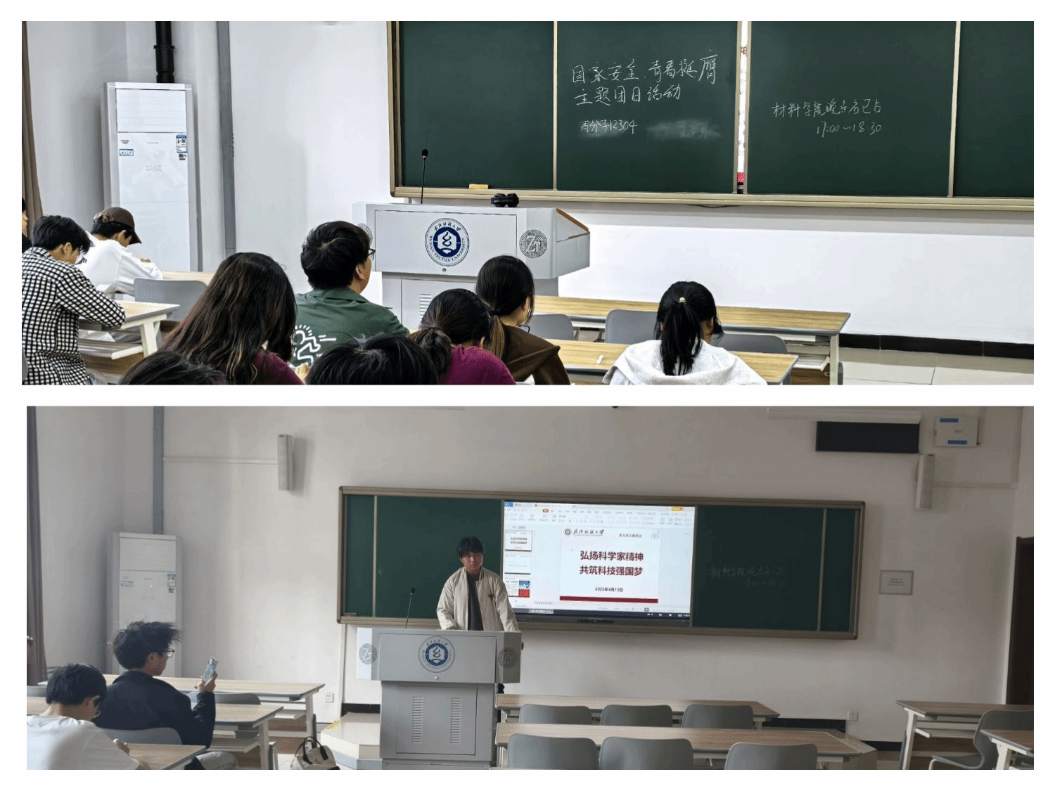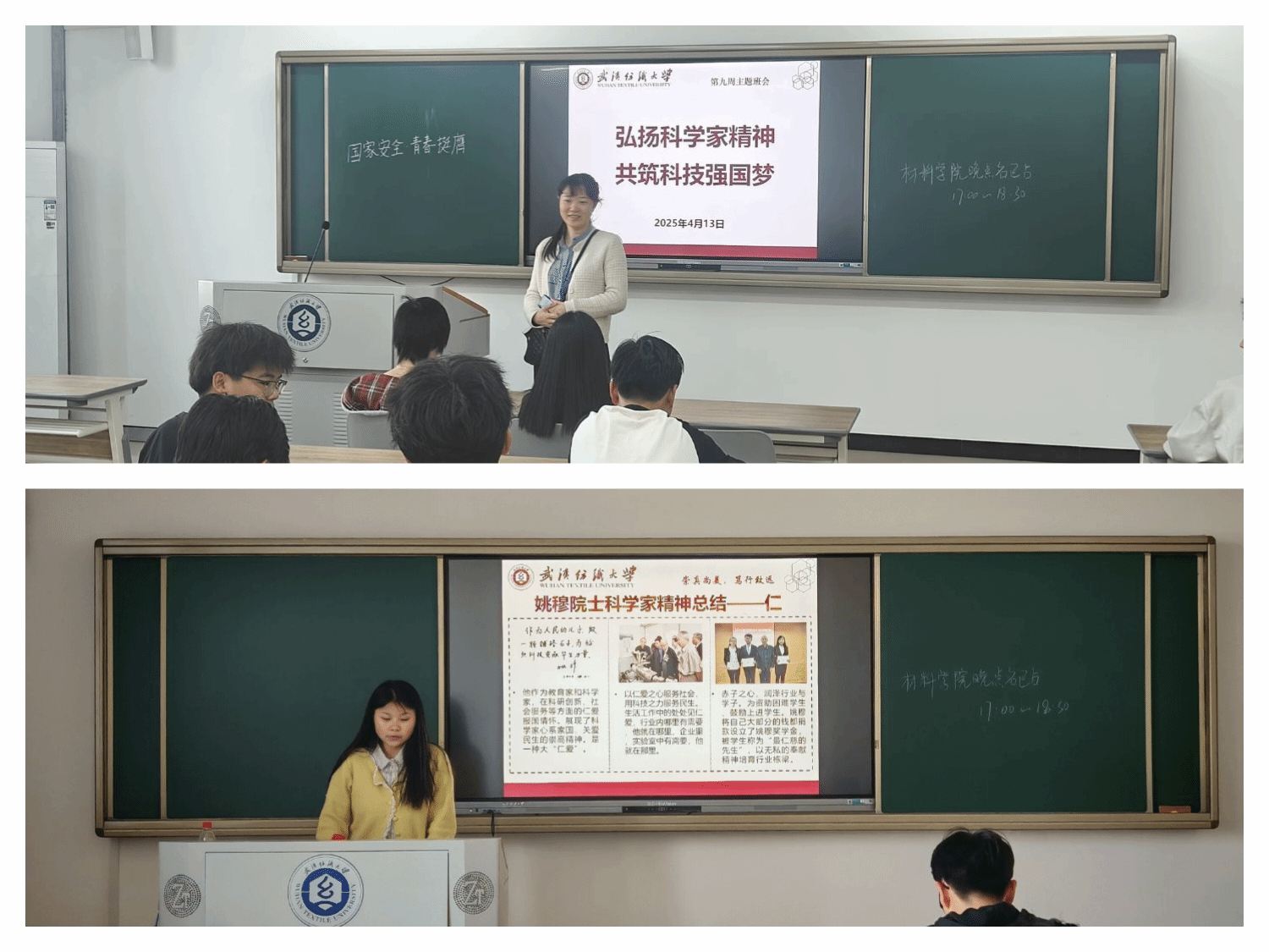 班会伊始,辅导员介绍了科学家精神是中国共产党人精神谱系的重要部分,包含爱国、创新、求实、奉献、协同、育人等内涵。在解读“科学家精神”时,指出爱国精神是其灵魂,众多科学家心怀祖国,为科技事业归国奉献;创新精神是关键,推动科研突破陈规;求实精神是根基,确保科研成果经得起检验;奉献精神让科学家们淡泊名利、潜心钻研;协同精神使科研团队凝聚力量攻克难题;育人精神助力培养科研新生力量。姚穆院士等科学家的事迹在会上着重分享。姚穆院士投身纺织行业,以不懈的努力和坚定的信念推动行业发展,其精神令人动容。此外,班会还结合“4.15全民国家安全教育日”,强调科技发展与国家安全息息相关,科技创新是维护国家安全的重要力量。