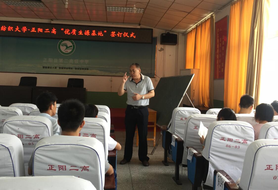 仪式上,正阳二高张校长向来宾介绍了该校的发展情况。他指出,正阳二高学校规模逐渐扩大,硬件也居全省前列,教师结构合理;学校始终将素质教育摆在首位,不断深化课堂改革,积极构建“和谐向上,幸福人生”的校园文化体系,为高等学校输送了一批又一批的优秀人才。他希望两校不断加强合作,共谋发展。