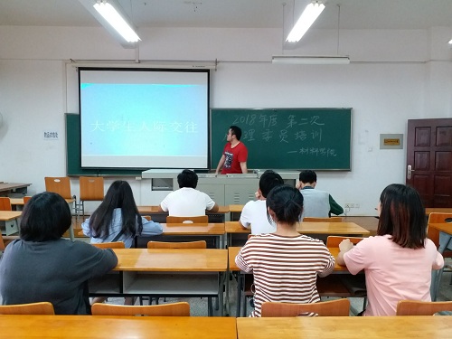 4月19日下午2点,院心理工作站在阳光校区07-210开展了主题为“大学生如何进行人际交往”的心理委员培训讲座。学院全体心理委员参加了此次培训会,学院朋辈心理员肖明威担任主讲人。