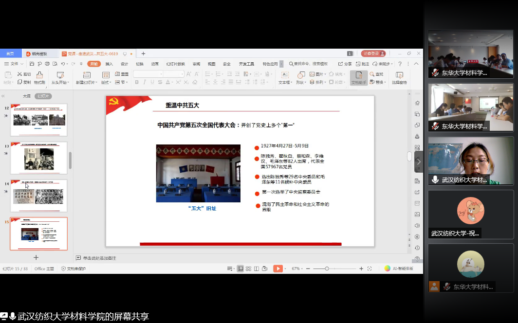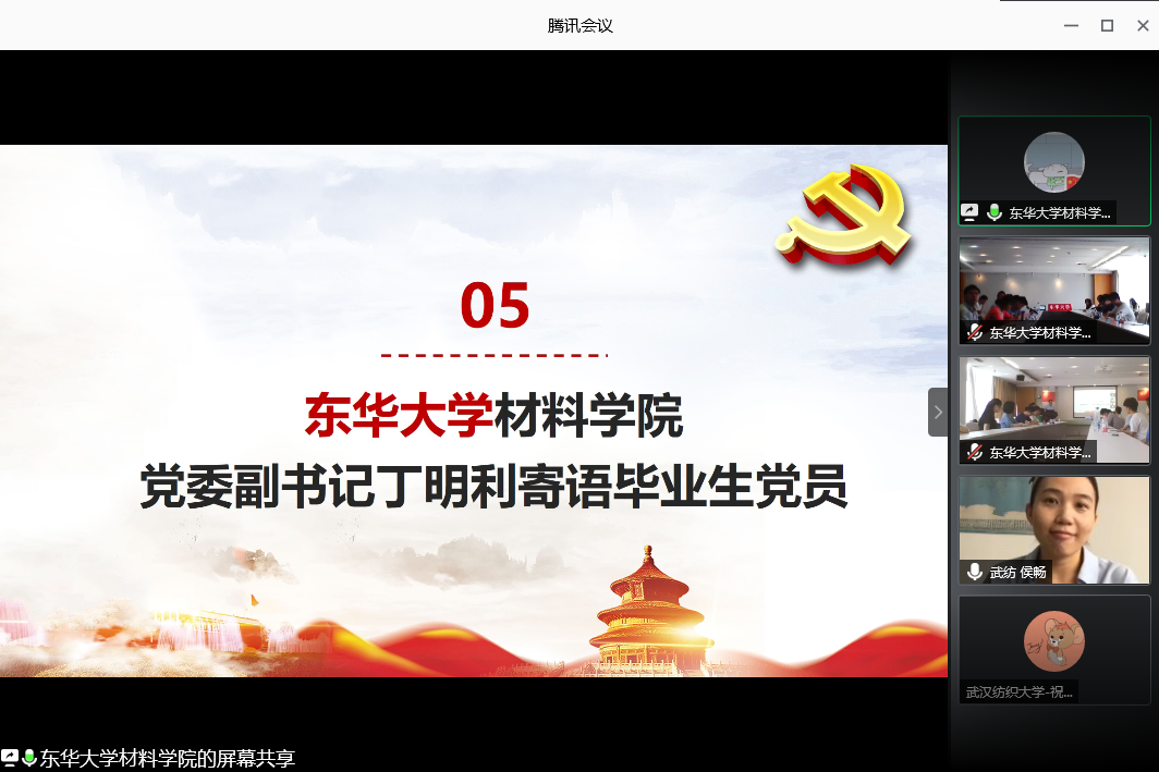2020 年 6 月 19 日 10:30,williamhill与东华大学材料学院在腾讯会议联合开展了“一五一实讲党史,牢记使命展担当”主题党日暨 2020 届毕业生党员离校教育,两院全体毕业生党员参加了此次会议。会议由东华大学williamhill官网学生党建辅导员吴佳主持。